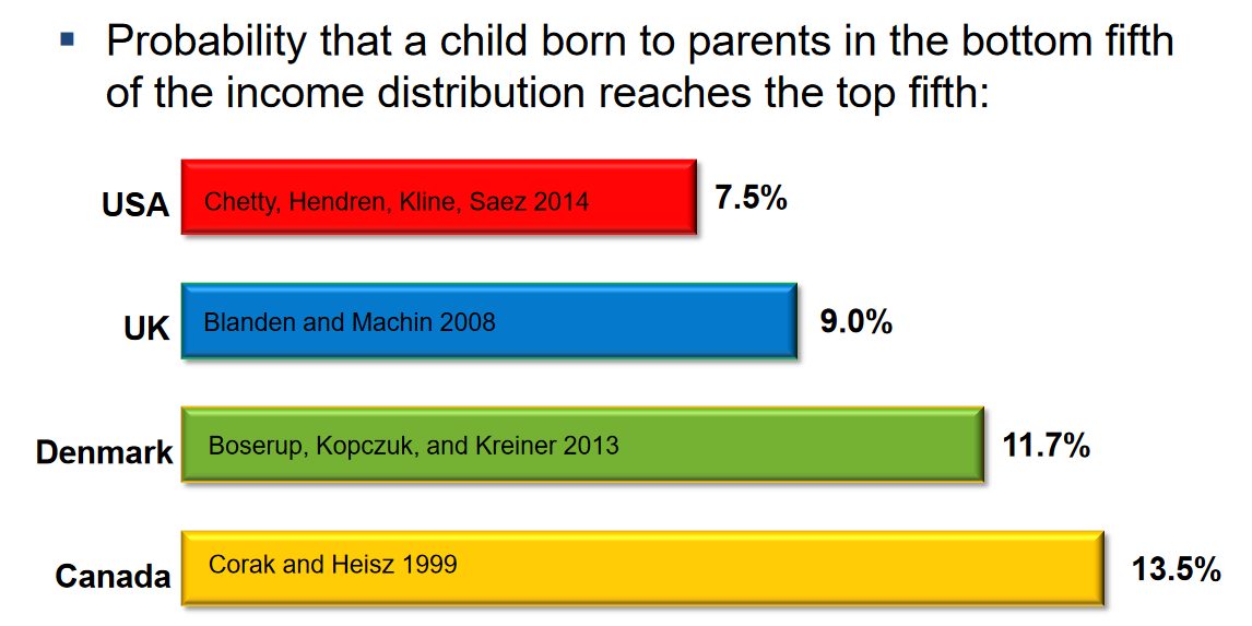 Economic mobility is a measure of how easily people move up or down the economic ladder based on their abilities. Essentially, it splits people into 5 income groups, each consisting of 20% of the population. In an idealized world where talent was randomly distributed at birth, we would expect that 20% of people in the top income bracket would have been born into the bottom income bracket and worked their way to the top. Real life doesn’t work that way, but by comparing one country to another we can see which countries are more or less merit-based. The results don’t look great for the “American Dream”: